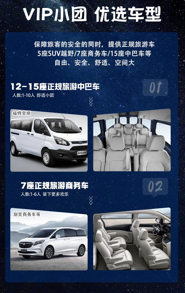 当地旅游用车1~10人,根据人数安排(5-15座)。