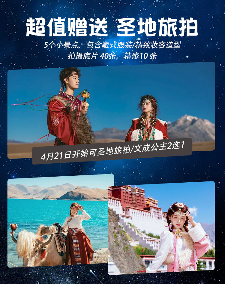 包含一套藏式服装,一次精致妆容造型(含假睫毛、花瓣、水钻、油彩彩绘等,无二次收费),含道具哈达、转经筒、面具、红头巾、串珠等。拍摄底片40张,精修10张。