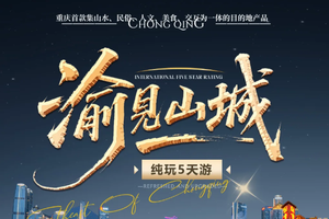 ★尊享住宿:全程四晚网评4钻酒店或3晚网评四钻+1晚江景特色客栈 ★尊贵体验:行程升级2+1保姆大巴车、头等舱座椅 ★巴渝美食:升级1餐重庆特色火锅 ★温馨服务:24小时管家服务,让客人更放心! ★重庆洪崖洞+解放碑+李子坝轻轨穿楼+天生三桥+仙女山+蚩尤九黎城+龚滩古镇 深度游览精华景点一网打尽 尊享礼遇-观看价值238元非物质文化遗产大型山水实景演出-《印象•武隆》