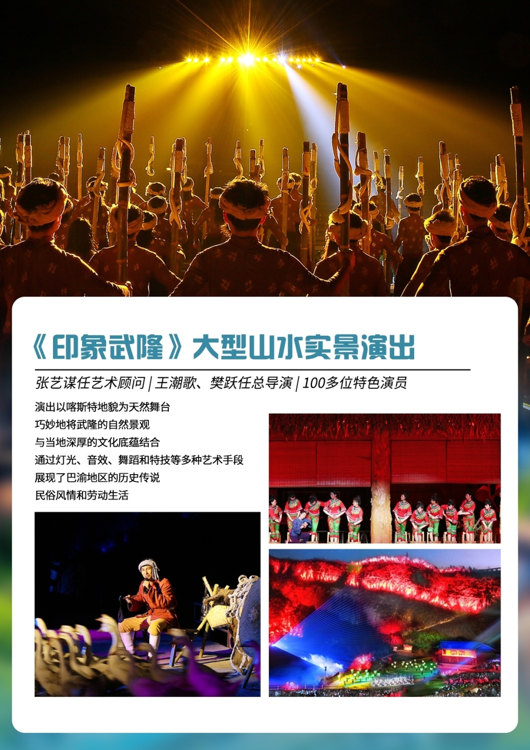 赠送观看大型山水实景演出—【印象▪武隆】(演出时间不低于70分钟)艺术和自然于天地之间,100多位特色演员现场真人真情献唱,聆听川江号子的荡气回肠,感受纤夫之爱,即使千百年的记忆远了,但现代文明与传统文化却相融了。