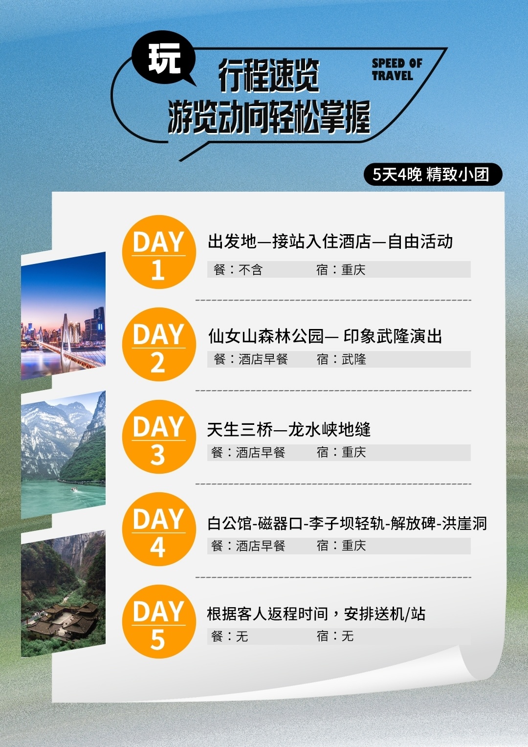 交通:广州/深圳至重庆往返机票/动车票(含机场建设费、燃油附加费)+当地5-9座车(根据人数订车型,保证一人一正座)