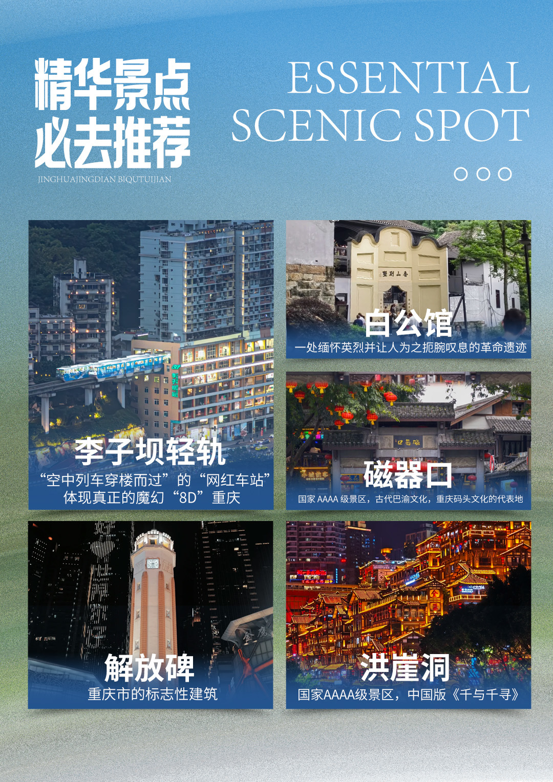 游览国家AAAA级景区千年古镇【磁器口】(游览时间不低于60分钟)一条石板路,千年磁器口,又名“小重庆”。古有民谣“白日里千人拱手,入夜后万盏明灯”便说明了此处的繁荣,磁器口 蕴含了丰富的文化及各类小吃,走进磁器口,吃麻花,喝酸奶,品地道重庆小吃,做一次本地人。