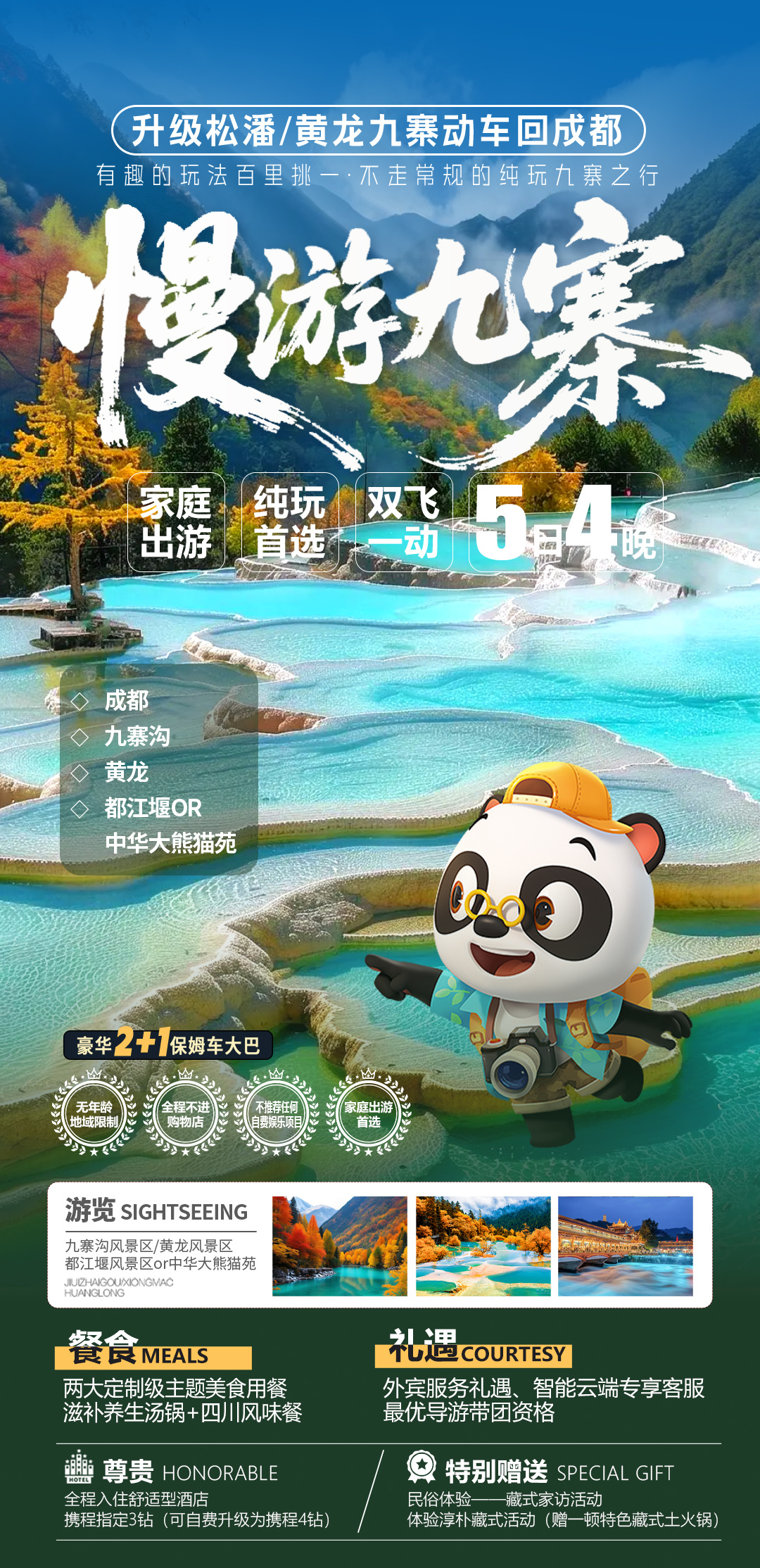 [游览] — 九寨沟风景区、黄龙风景区、都江堰风景区or中华大熊猫苑 [尊贵] — 全程入住舒适型酒店,携程指定3钻(可自费升级为携程4钻) [纯粹] — 无年龄地域限制,全程不进购物店,不推荐任何自费娱乐项目,家庭出游首选 [独家] — 有趣的玩法百里挑一,不走常规的纯玩九寨之行 [餐食] — 九寨沿线两大特色餐+藏式民俗美食,餐餐惊喜餐餐地道 [礼遇] — 外宾服务礼遇、智能云端专享客服、最优导游带团资格、豪华空调大巴 ![]() |
