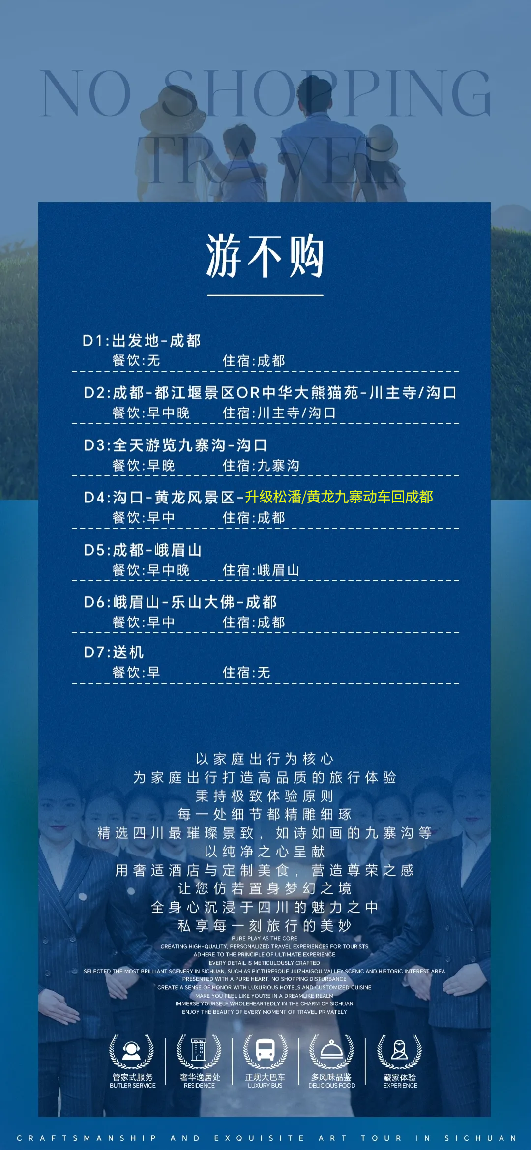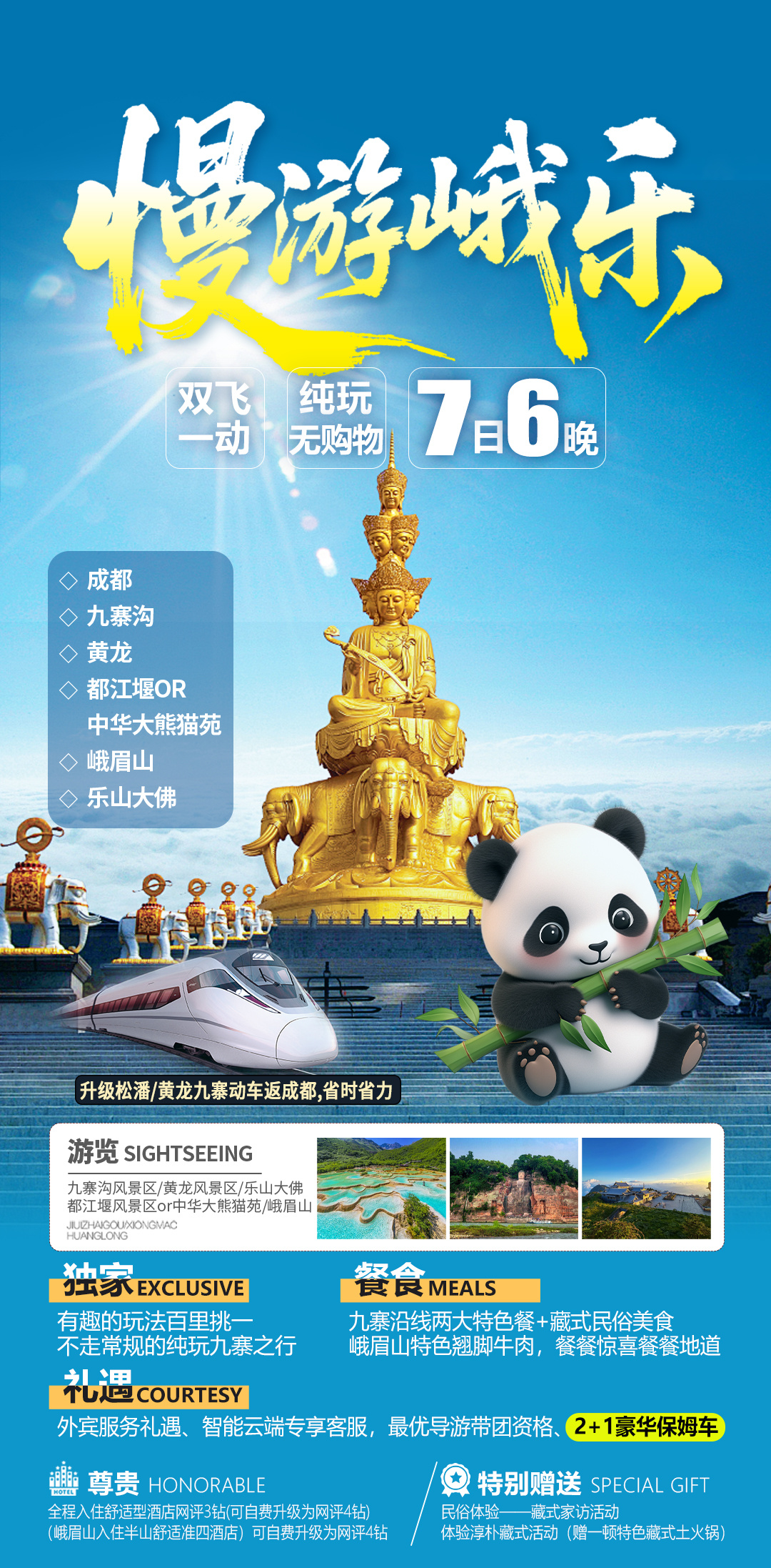 [游览 ] — 九寨沟风景区、黄龙风景区、都江堰风景区or中华大熊猫苑、峨眉山、乐山大佛 [尊贵] — 全程入住舒适型酒店,携程指定3钻(可自费升级为携程4钻) (峨眉山入住半山舒适准四酒店),可自费升级为携程4钻 [纯粹] — 无年龄地域限制,全程不进购物店,不推荐任何自费娱乐项目,家庭出游首选 [独家] — 有趣的玩法百里挑一,不走常规的纯玩九寨之行 [餐食] — 九寨沿线两大特色餐+藏式民俗美食+峨眉山特色翘脚牛肉,餐餐惊喜餐餐地道 [礼遇] — 外宾服务礼遇、智能云端专享客服、最优导游带团资格、豪华空调大巴 ![]() |
