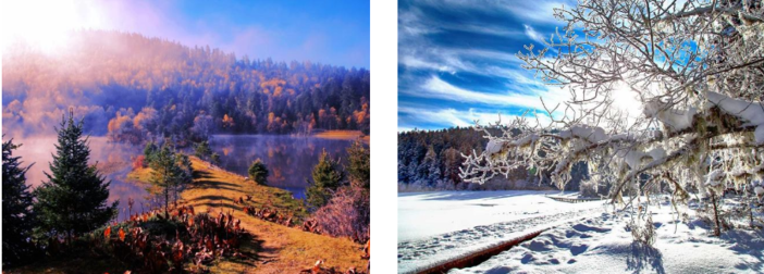 普达措四季皆美,春季3-5月赏高山草甸与杜鹃花;夏季6-8月消暑乘凉,观赏野花盛放的草甸;秋季9-11月色彩斑斓的密林;冬季12月至次年2月可欣赏雪白下的碧蓝湖波。