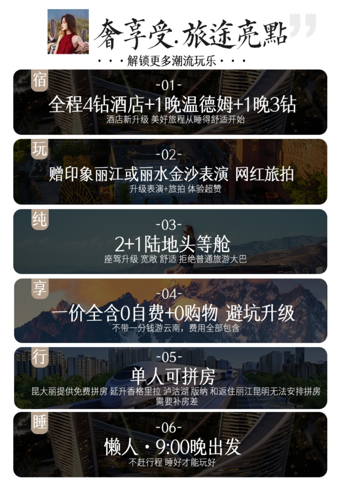 云南是个多民族的省份,当地以酸辣口味为主、凉菜居多;旅游的团队餐一般是10人一桌,云南饮食和其他省份有较大差异,可能不合您的口味,请作好心理准备;当地水土为弱酸性,建议多饮茶水。