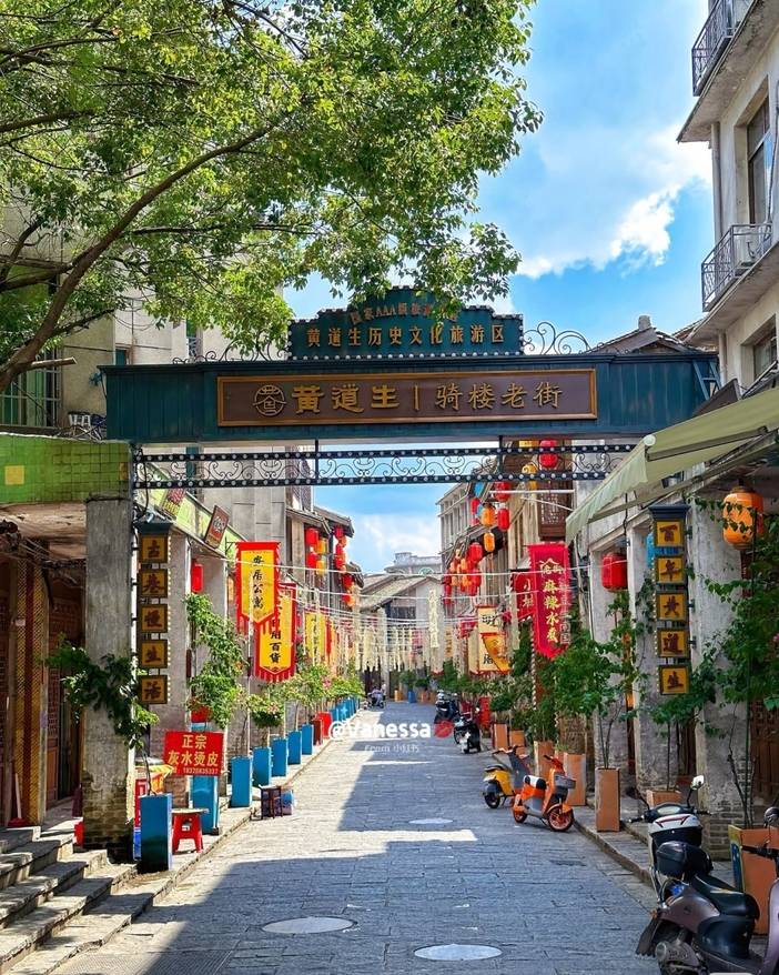 游览【黄道生骑楼老街】老街又叫大街,是龙南城仅存的一条保存最为完好的古街,整条街不长 也不宽,长不到一里,宽不足两车道。街道两旁斑驳的骑楼见证了老街当年的繁华与喧嚣。老街的骑楼 是土木结构的,高为二至三层,门窗上黑褐色的木雕古色古香,刻满了经年岁月留下的印痕。老街店铺 的木门很有特色,是由一块块木板竖立并排拼凑而成的,里面再加上一道门栓。清晨店铺开张取出门板, 傍晚关张再把木板沿着地下的凹槽关闭店铺。就这些简单的线条勾勒出了这座城市那段历史的轮廓,唤 起了人们心中那些沉默已久的记忆。