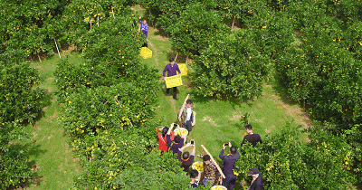 游客抵达关西围停车场后,由工作人员引导至果园(步行约2–3分钟)。