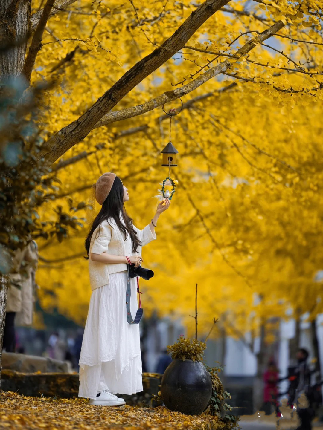 黄金大道,街道边种了两排银杏树,和白色的路灯相配,宛若欧洲小镇,风情万种,金秋的帽子峰,呈现给游客一个五彩斑斓的世界。