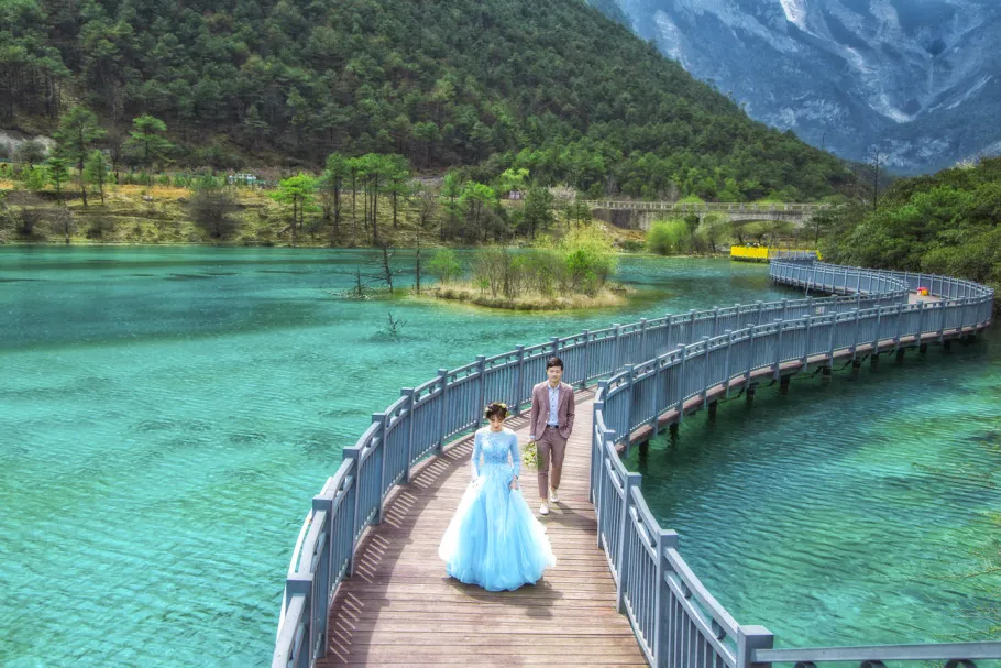 1. 玉龙雪山:纳西族心中的“神山”,北半球最近赤道终年积雪的山脉,主峰扇子陡海拔5596米,山体巍峨壮观,银装素裹。乘坐大索道直达海拔4506米的冰川公园,沿途欣赏高山草甸、原始森林、冰川地貌,情侣携手徒步栈道,挑战更高海拔,感受雪山的神圣与壮阔(建议提前准备氧气罐、保暖衣物)。