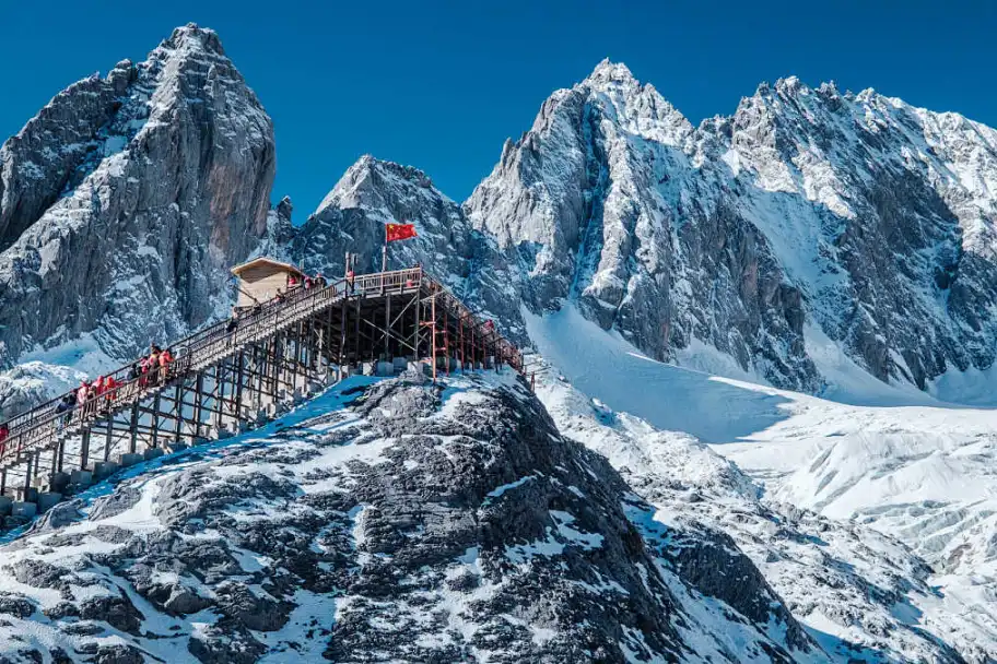 冰川大索道(特别说明:由于旺季(暑期、国庆、春节)景区人流量增加,玉龙雪山大索道实行人数限制,每日大索道浏览人数为1万人次,大索道无票的情况下默认走云杉坪索道,差价退80元/人)全长2914米,从海拔4680米观景平台直达下站,可俯瞰雪山、冰川和森林景观。