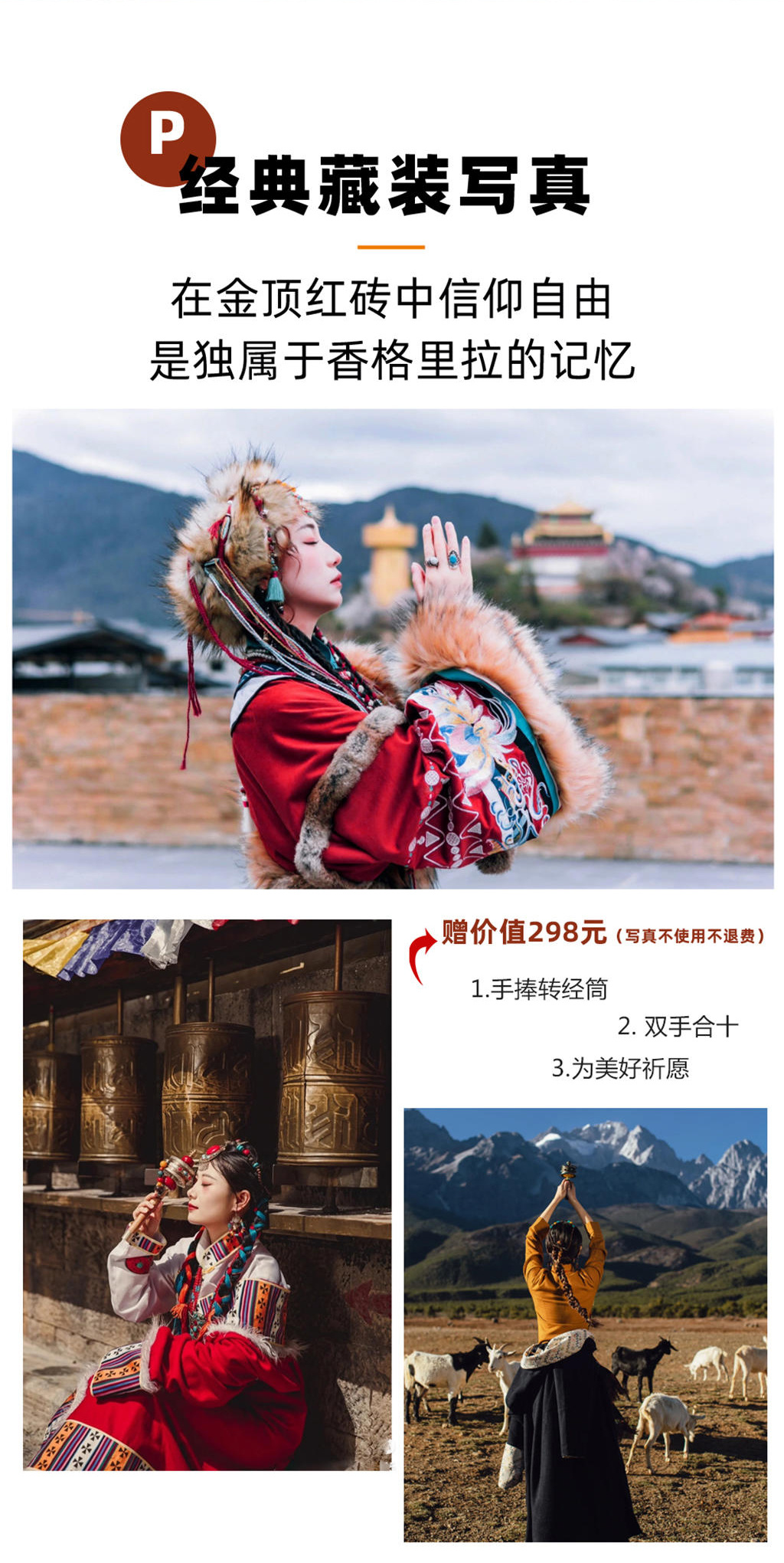 1、藏式风情写真是以松赞林寺景致为背景,在专业摄影师的指导下进行拍摄。
