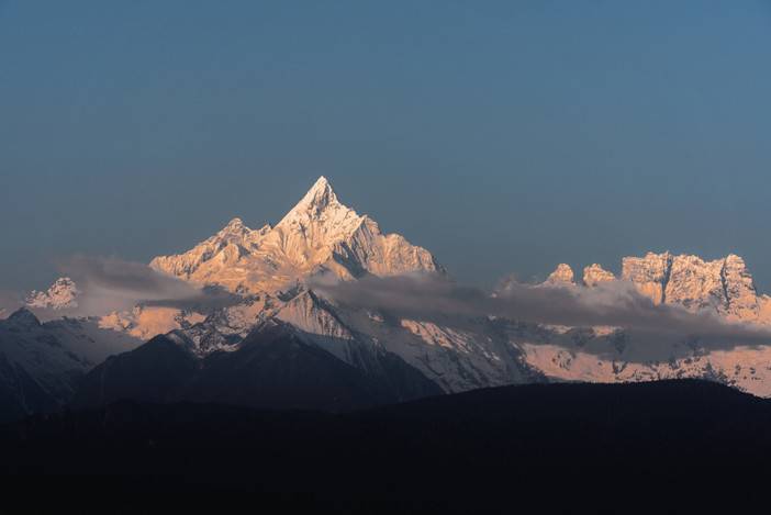 梅里雪山在藏区称“卡瓦格博雪山”,平均海拔在6000米以上,称为“太子十三峰”,海拔6740米的主峰是云南的最高峰,至今仍是人类未能征服的“处女峰”,也是一座因文化保护而立法禁止攀登的高峰。