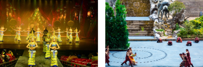大型歌舞《丽江千古情》演出重现丽江长达千年的历史与传说,引领观众穿越雪山,在旷远原始的洪荒之域、在泸沽湖畔的摩梭花楼、在挟风裹雨的茶马古道、在金碧辉煌的木府、在浪漫凄情的玉龙第三国、在世外桃源般的香巴拉相约一场风花雪月的邂逅,感受一个美丽的时刻。