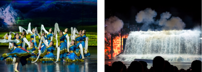 大型歌舞《丽江千古情》演出重现丽江长达千年的历史与传说,引领观众穿越雪山,在旷远原始的洪荒之域、在泸沽湖畔的摩梭花楼、在挟风裹雨的茶马古道、在金碧辉煌的木府、在浪漫凄情的玉龙第三国、在世外桃源般的香巴拉相约一场风花雪月的邂逅,感受一个美丽的时刻。