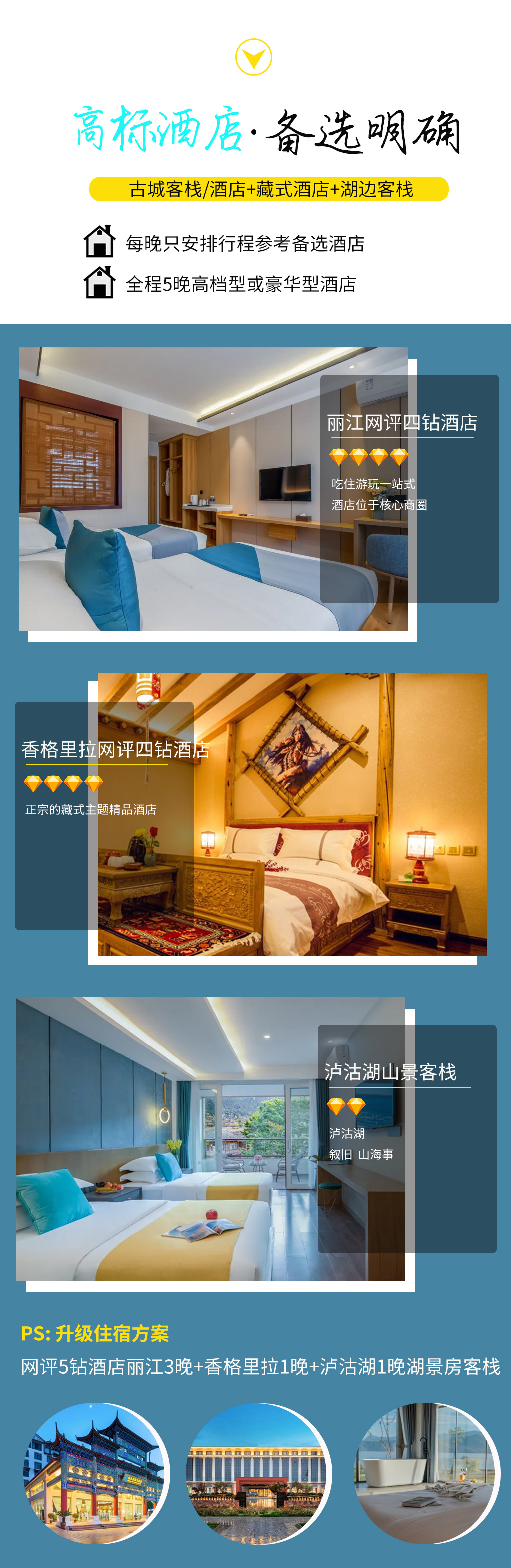 5钻酒店:丽江国际大酒店/丽歌丽呈酒店/丽江悦云别院度假酒店/丽江金林豪生大酒店/丽江复华丽朗酒店或其他同级酒店。