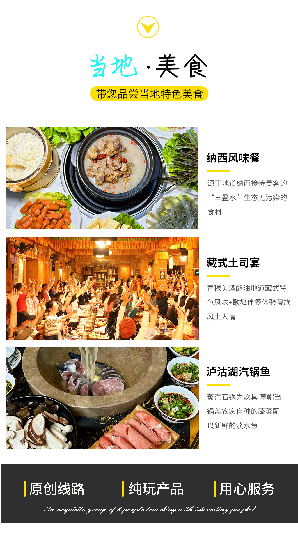 2、膳食:酒店含5次早餐,行程含2次正餐(民族风味特色餐40元/人/餐,香格里拉土司宴70元/人/餐),其余行程中的用餐客人自行安排,自理费用。