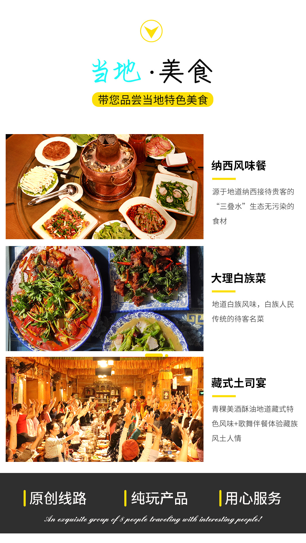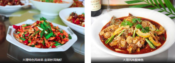【午餐:大理白族风味家常菜】大理白族菜,食材上选用就地取材的洱海鱼虾与田间地头新鲜蔬菜,搭配大理白族特有的腌制型酸辣调味品,加之白族“金花”与“阿鹏”精湛的厨艺,使得大理菜有别于其他地区菜品,品白族菜就如品大理的“上关花,下关风,苍山雪和洱海月”别有一番风味。