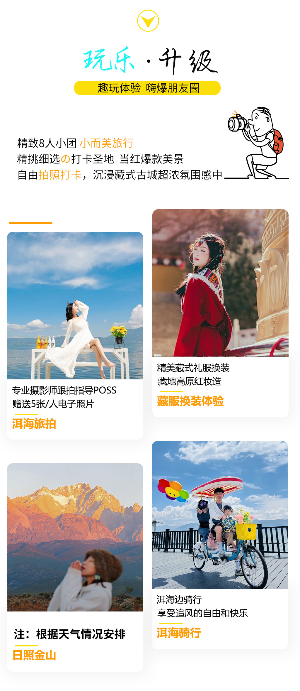 1、洱海廊道的骑行过程中,摄影师以大理洱海为背景,借助洱海边的网红道具(玻璃球、白椅子、白桌子,天空之镜等)进行拍摄,旅拍含5张/人电子照片,原片不赠送,赠送1人1杯海边茶饮。