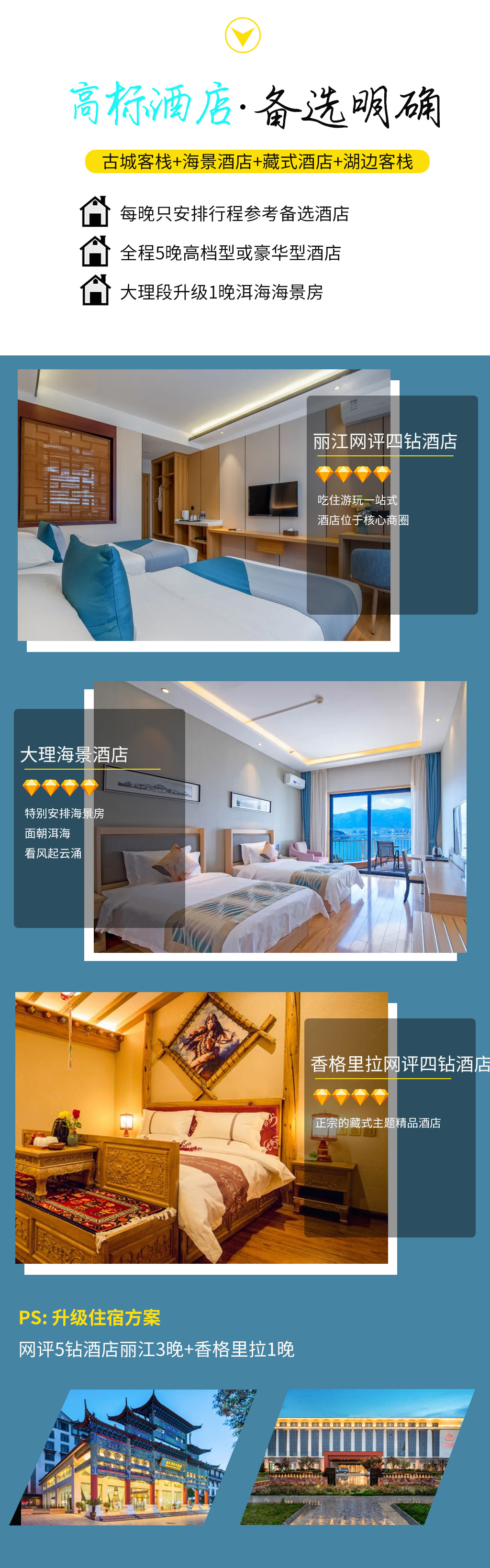 4钻酒店:丽江古城宜尚PULS酒店/丽江藏元雪山揽景酒店/丽江凤皇养生度假酒店/丽江古城天香格酒/丽江金悦源酒店/丽江古城艾泽拉斯轻奢客栈或其他同级酒店。