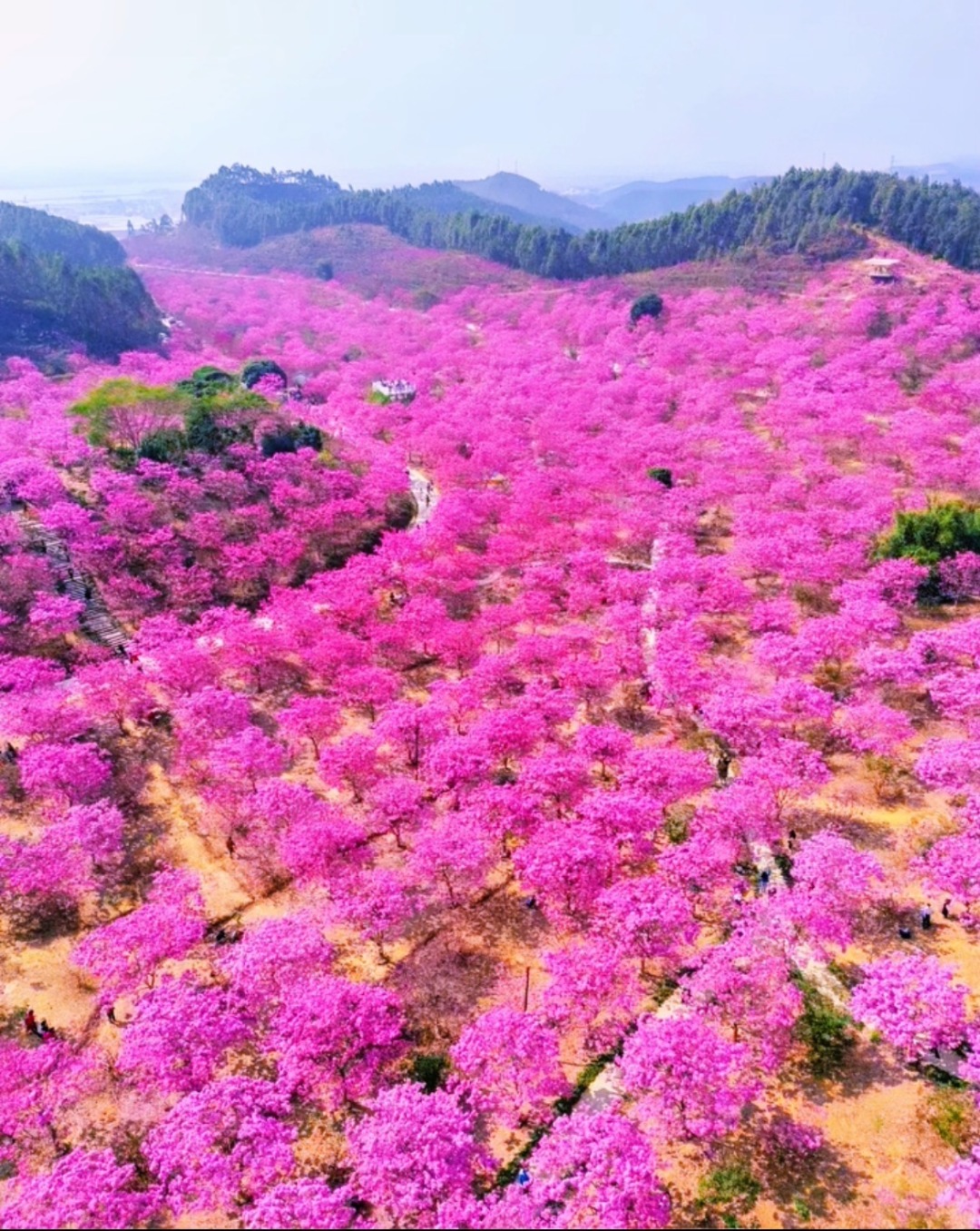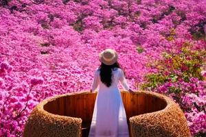 连绵起伏的山丘宛如铺上了粉紫色的锦毯,远远望去,像一片粉嫩海洋,蔚为壮观吸引游客咔嚓拍起来...