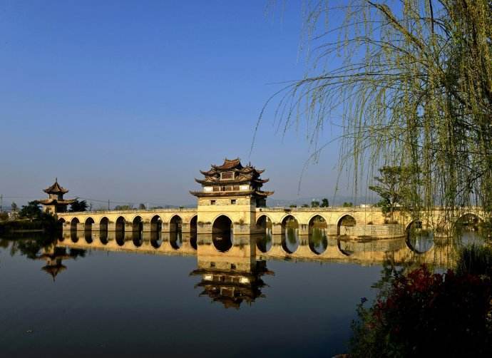 【双龙桥】俗称“十七孔桥”,是座三阁十七孔大石拱桥。它坐落于建水古城城西5里处,横跨泸江与塌冲河交汇之水面上,是云南省著名古迹之一