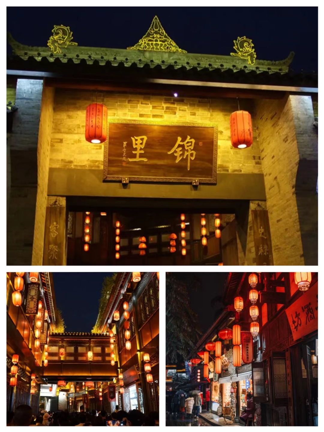 锦里古街的道路不宽,青石板路蜿蜒前伸。主街两旁的仿古建筑一字排开,青灰色的砖瓦屋顶错落有致,过梁的横木粗壮浑圆,各式各样的木质窗棱古朴典雅,店铺的望子随风飘扬。蜿蜒曲折的院落、街巷、水岸、湖泊、荷塘、石桥相呼应,主题会所、餐饮店、商店坐落其中,水波灯影,别有一番意境。