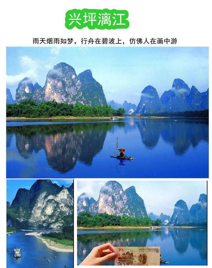兴坪,桂林山水之精华,这里有著名的九马画山、黄布倒影、僧伲斗嘴、朝板山、榕潭揽胜、雾绕青螺,这里有两个总统游过的神秘、古朴村落——渔村,这里有被印制在1999年版贰拾元人民币背景图案上的兴坪大河背秀丽风景。古往今来,兴坪秀丽的山山水水,引得无数骚人墨客为之陶醉。