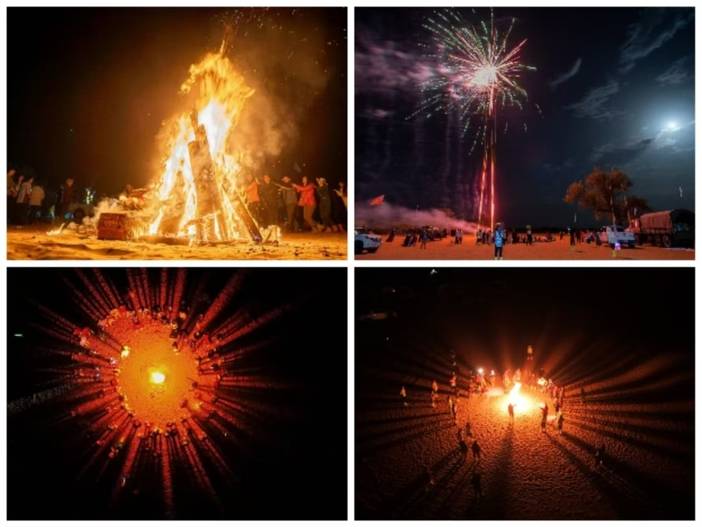晚餐为炒菜+米饭+大盆清炖羊肉,等大家享用完晚餐,我们会根据天黑下来的时间确定篝火晚会+高空烟花的时间,一次沙漠腹地的篝火晚会一定是你一生最美好的回忆之一。