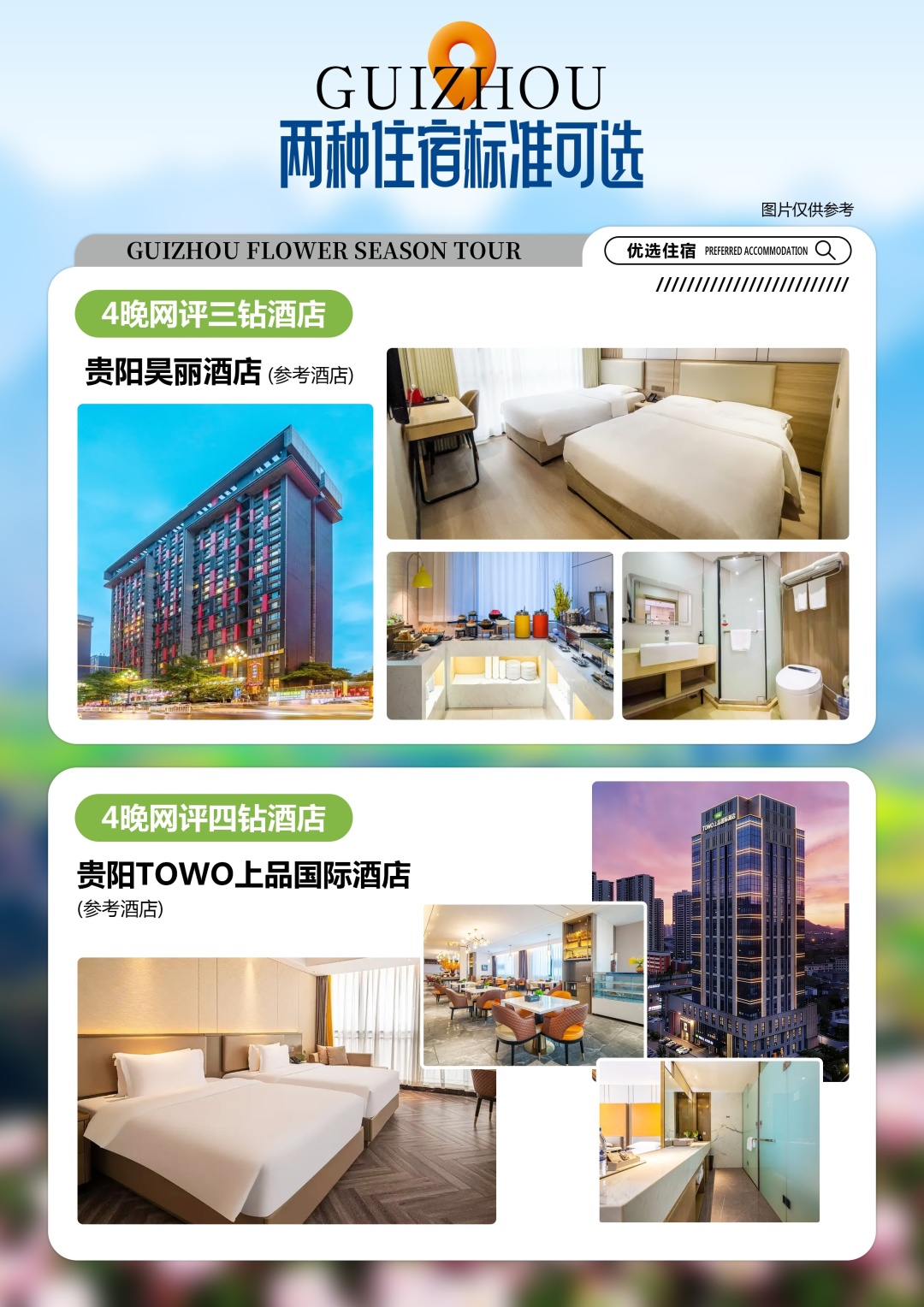 3. 贵州酒店标准偏低,请旅游者提前做好心理准备。如遇旺季酒店资源紧张或政府临时征用等特殊情况,我社有权调整为同等级标准酒店。