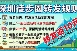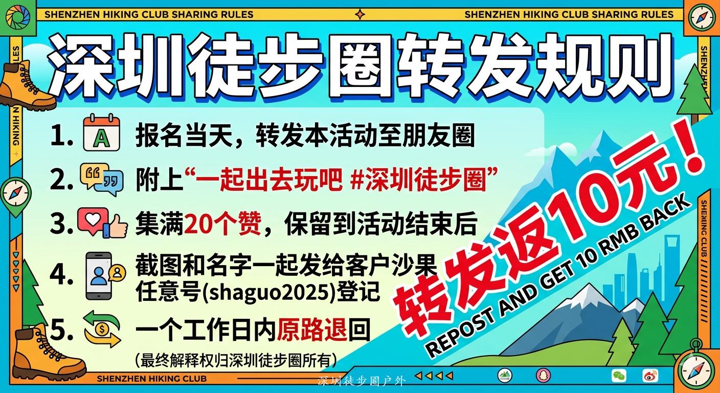 ▼进群方式:【深圳徒步圈户外】小程序→点我的→点活动订单→点开出行活动订单→点击扫码加入活动微信群也可以联系客服沙果(任意号)拉进群(沙果微信号:shaguo2025)