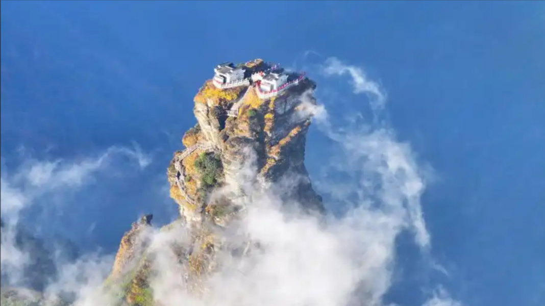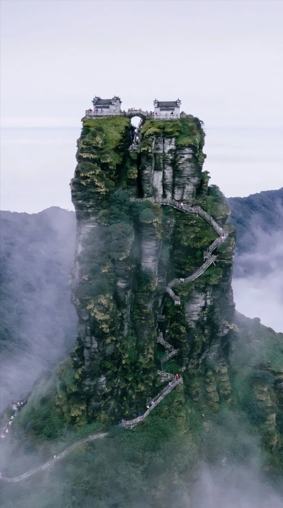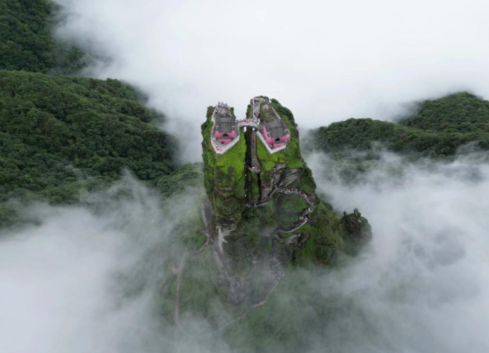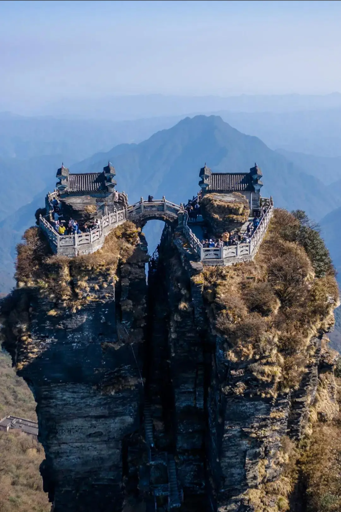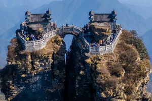 Ⅰ.攀登「红云金顶」,海拔2336米,晨间红云瑞气常饶四周,因此而得名。山峰拔地而起,垂直高差达百米,上半部分一分为二,由天桥链接,两遍各建一庙,一边供奉释迦佛,一边供奉弥勒佛。由此印证现代佛(释迦牟尼)向未来佛(弥勒佛)的交替。