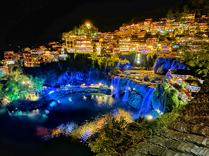 夕阳收起最后一道霞光的时候,盏盏街灯与霓虹灯在芙蓉古镇的夜空渐次亮起,暖冷、明暗渲染,勾勒出沱江与山城的轮廓。绚烂的光影中山、水、人、桥、吊脚楼……动静相融、相衬,层次分明、色彩斑斓,整座古城美轮美奂,尽显古镇的迷人。徜徉古城,令人如在画中游。