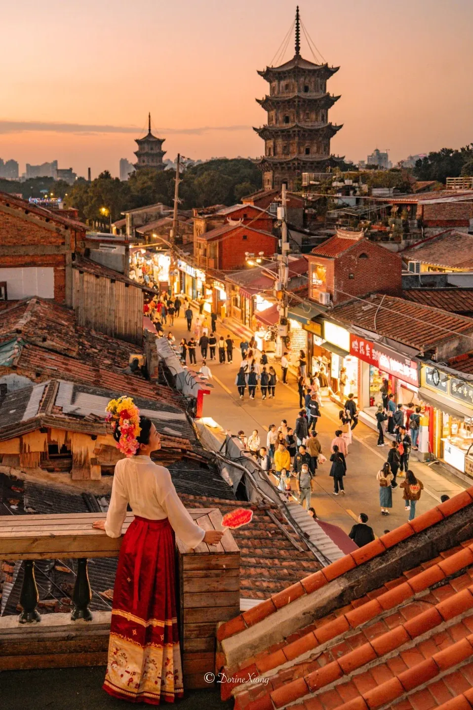 【西街】西街融合了泉州的许多老街巷,有古时的驿站,官邸人家,也有今日满街都是的泉州本土饮食和生活物件,特别生活化的一条街道。光是传统的、平行的视角怎么够呢?我们为你在找寻到一处至高点,可以俯瞰整个西街的熙熙攘攘的“烟火气”可以和东西塔来一组“小鸟依人”的合影;