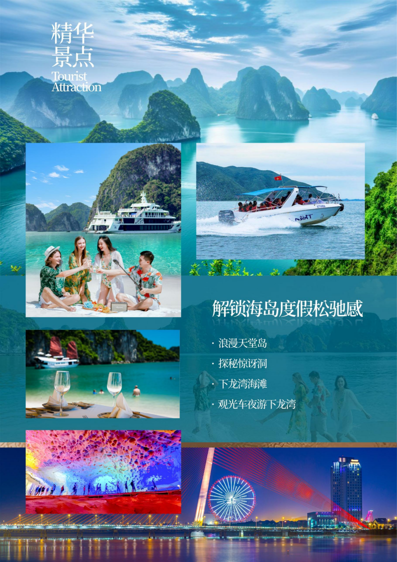 漫游著名电影《007·明日帝国》《金刚·骷髅岛》取景拍摄地、世界八大自然遗产及世界新七大自然奇观之一“海上桂林”【下龙湾】在1500多平方公里的海面上,耸立着3600多座大小不一、千姿百态,被海水侵蚀成壮丽非凡的景观的喀斯特山石,奇山怪屿犹胜普吉岛攀牙湾。登临海岛游览溶洞奇观胜境,途径骆驼峰、熊猫山等石像景点;