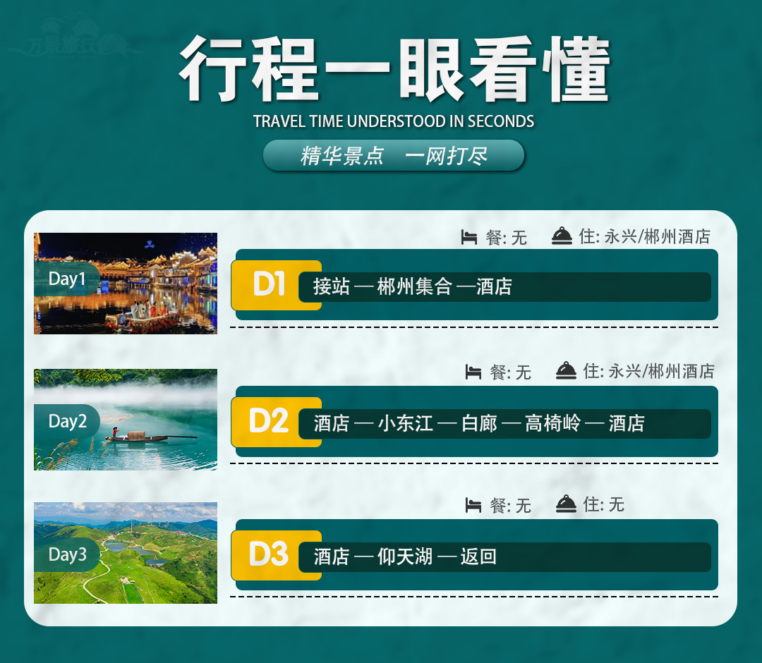 此次旅游总共跨越3天时间,以上行程领队会根据实际情况作相应调整,但总行程不变。