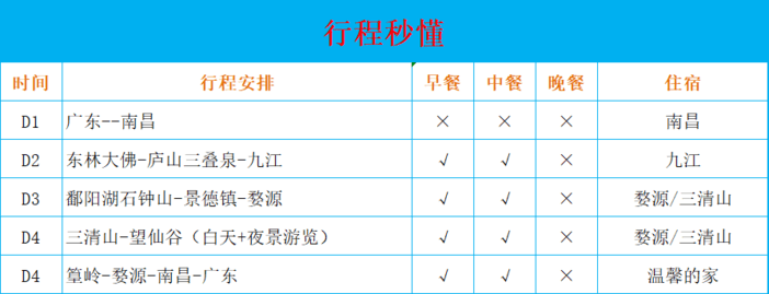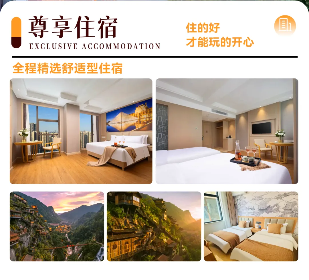 住宿:4晚舒适酒店标双(2人一间),如无人拼房,需补房差(江西地区酒店不提供洗漱用品,请自备)